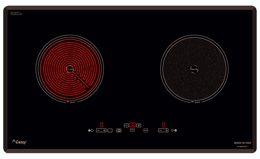 Bếp điện từ Canzy CZ-65BS gồm 2 vùng nấu. Vùng nấu trái với công suất là 2000W khi kích hoạt tính năng nấu siêu nhanh Booster công suất lên tới 2400W, vùng nấu hồng ngoại phải sử dụng mâm nhiệt E.G.O Hilight với mức công suất tối đa là 2400W. Chức năng Booster nấu siêu nhanh, tuy nhiên thời gian tối đa mặc định dùng chức năng này là 10 phút/lần tránh quá tải.