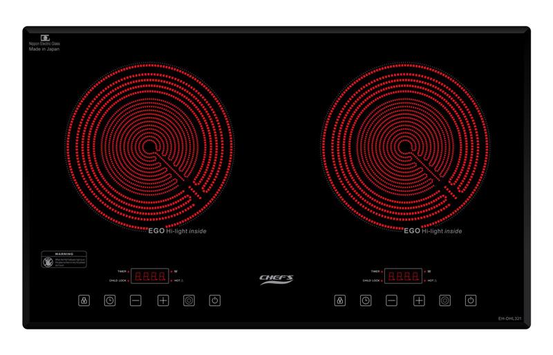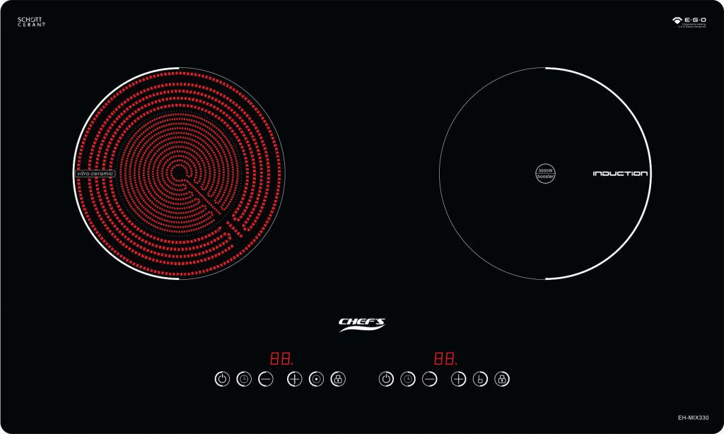 Bếp điện từ Chefs EH-MIX2000A gồm 2 vùng nấu với với tổng công suất chia sẻ là 3400W. Vùng nấu phải với công suất là 2000W, vùng nấu hồng ngoại phải sử dụng mâm nhiệt E.G.O Hi-light với mức công suất tối đa là 2200W.