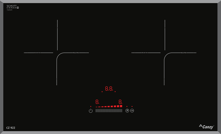Bếp từ Canzy CZ TL67GA gồm 3 vùng nấu. Vùng nấu từ lớn với công suất là 2300W khi kích hoạt tính năng nấu siêu nhanh Booster công suất lên tới 3000W, vùng nấu từ trung với công suất là 1800W khi kích hoạt tính năng nấu siêu nhanh Booster công suất lên tới 2200W, vùng nấu từ nhỏ với công suất là 1200W khi kích hoạt tính năng nấu siêu nhanh Booster công suất lên tới 1600W. Chức năng Booster nấu siêu nhanh, tuy nhiên thời gian tối đa mặc định dùng chức năng này là 10 phút/lần tránh quá tải.