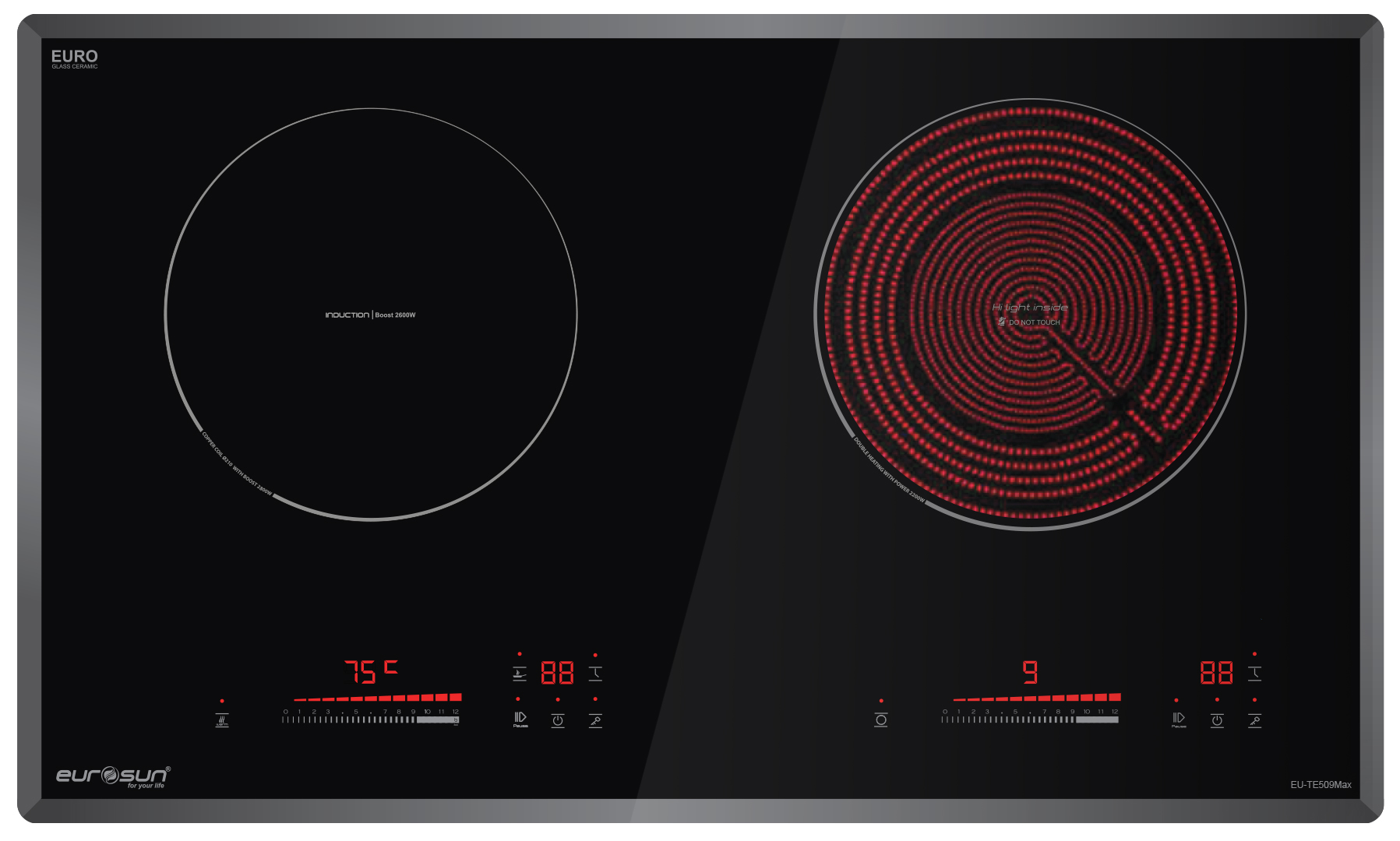 Mã sản phẩm Eurosun T708 Pro Kiểu dáng Bếp từ lắp đặt âm Xuất xứ Made in Malaysia Loại sản phẩm Bếp từ Eurosun Số bếp nấu 2 từ Mặt kính EURO Platinum Điều khiển Trượt cảm ứng Tính năng Bridge INVERTER thông minh Tạm dừng khi đang nấu Có Cảm ứng chống tràn Có Mức điều chỉnh công suất 1 đến 12 Tạm dừng Pause ‘Stop go’’ Có Chiên rán Fry Có Chế độ hẹn giờ Có Hệ thống khoá an toàn Có Tự động tắt khi khi xoong nồi rời vùng nấu Có Chức năng hâm nóng Warm keep 65ºC, 75ºC, 85ºC Chất liệu/ màu sắc Kính đen Bảng điều khiển Cảm ứng trượt 9 mức công suất + Booster Công suất Công suất lò trái : 2200W – Booster 2800W