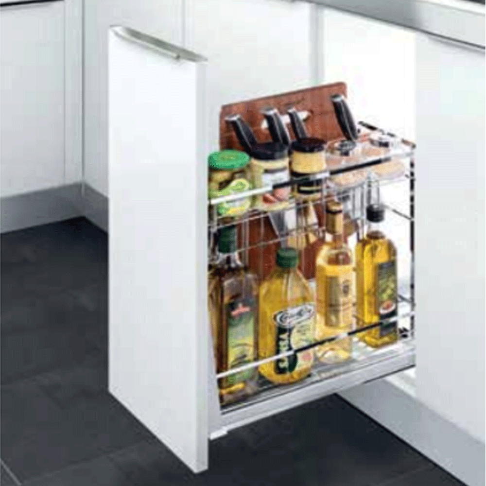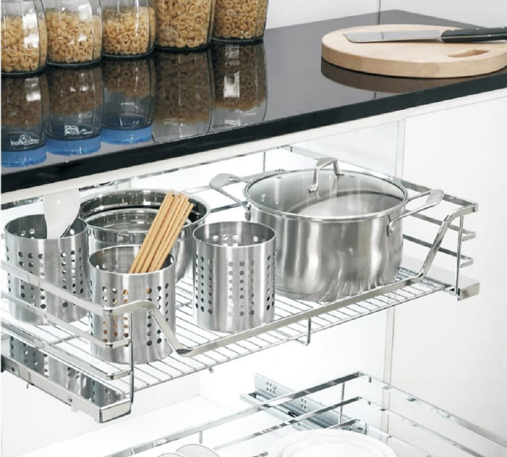 Giá đa năng để dao thớt, gia vị, chai lọ là sản phẩm vô cùng hữu ích cho không gian tủ bếp dưới. Các loại chai lọ, gia vị như nước mắm, dầu ăn, tương … và các gia vị nấu nướng hàng ngày, dao thớt nhờ nó có thể được sắp xếp một cách khoa học, sạch sẽ, gọn gàng tiết kiệm không gian trong tủ bếp.